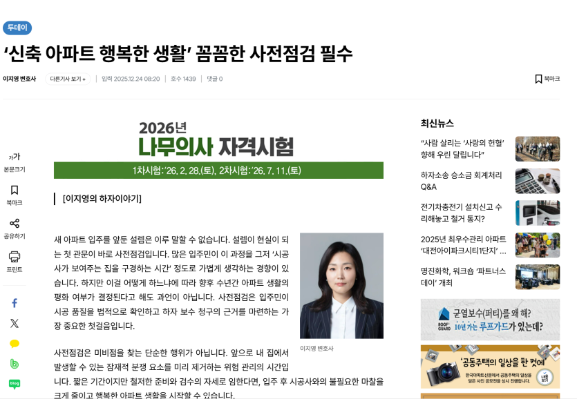 (25년 12월 24일) ‘신축 아파트 행복한 생활’ 꼼꼼한 사전점검 필수