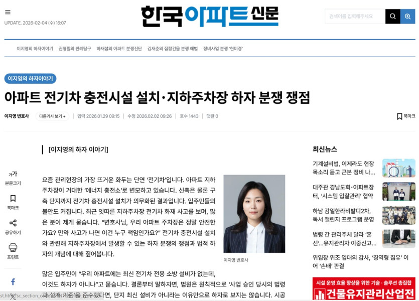 (26년 1월 29일) 아파트 전기차 충전시설 설치・지하주차장 하자 분쟁 쟁점