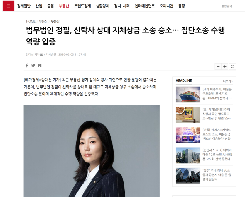 (26년 2월 3일) 법무법인 정필, 신탁사 상대 지체상금 소송 승소… 집단소송 수행 역량 입증
